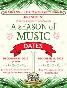 Come join the Gainesville Community Band as we celebrate the festivities of the Holiday Season! December 14, 2025 at 3 pm ...